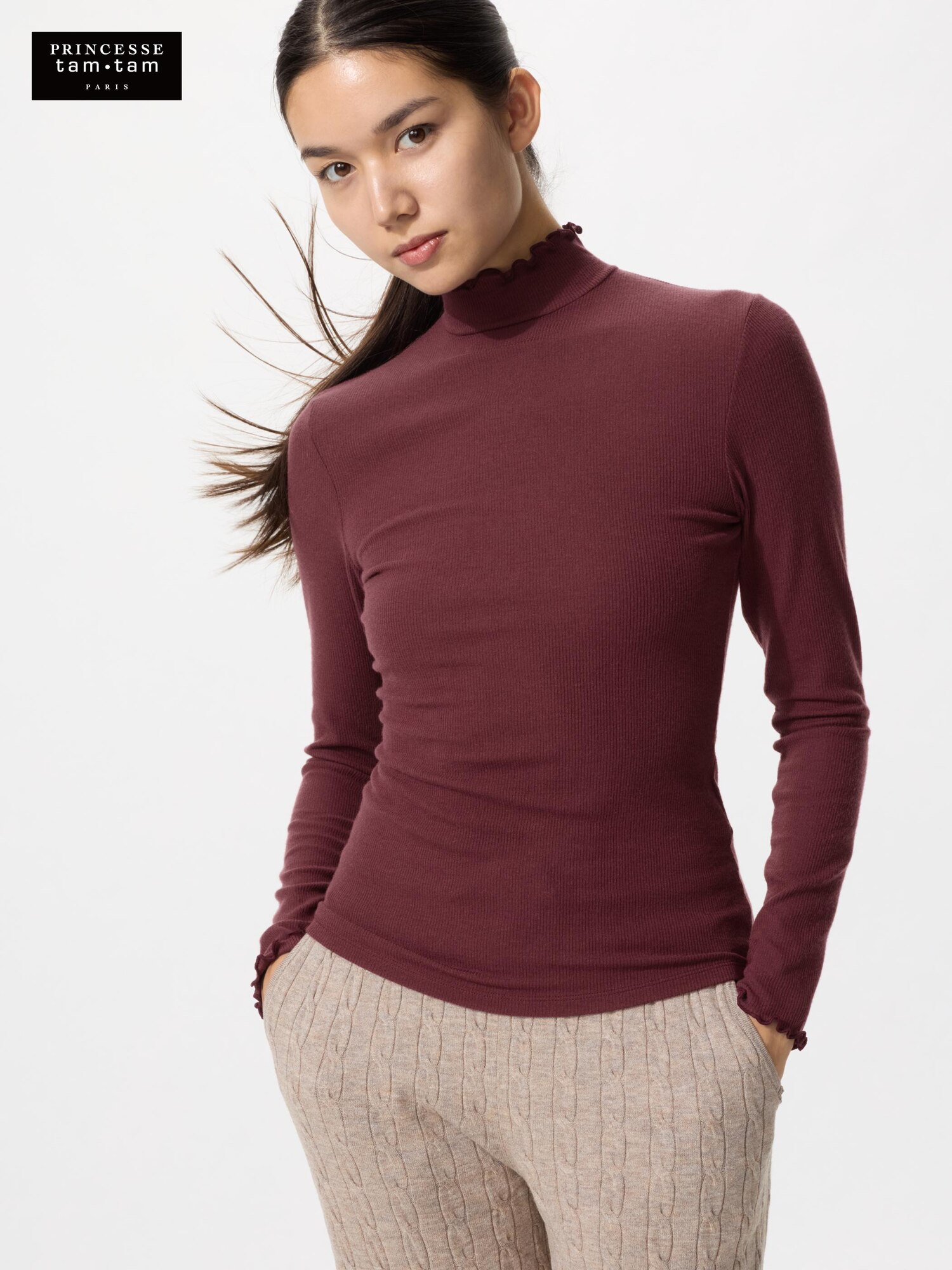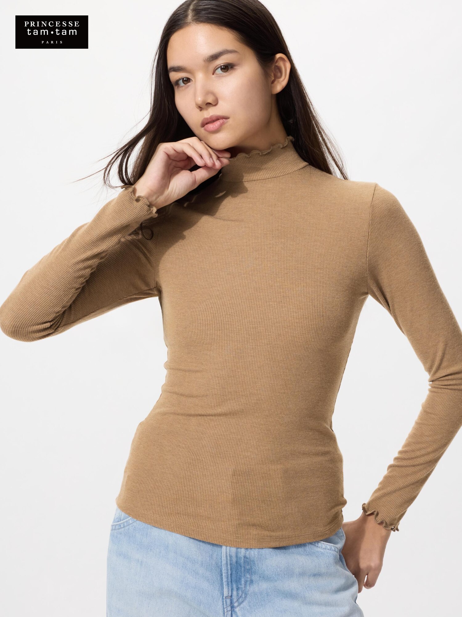 Очень теплая футболка с высоким воротом в рубчик из смеси кашемира Heattech