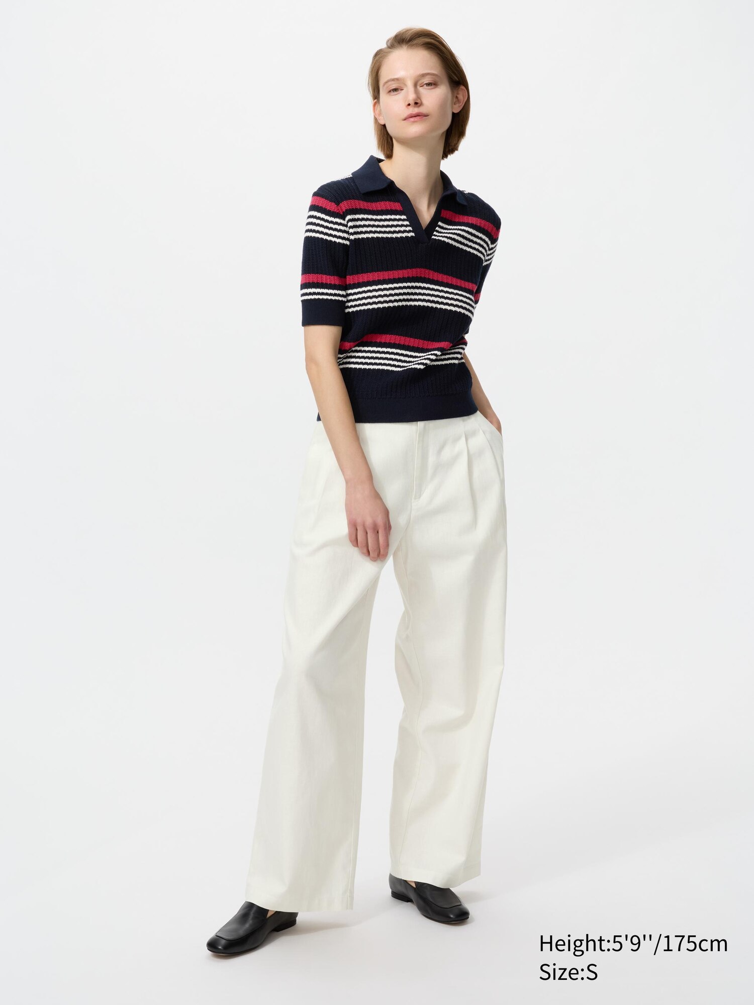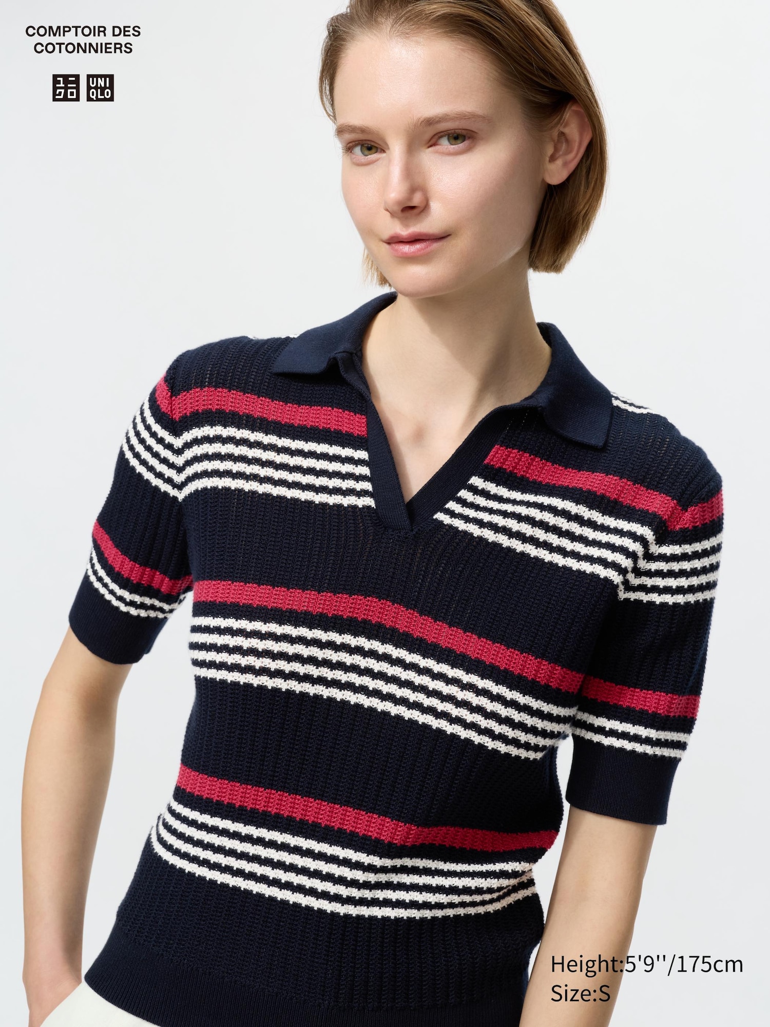 Cotton Pointelle Skipper Polo Jumper (Short Sleeve, Striped)